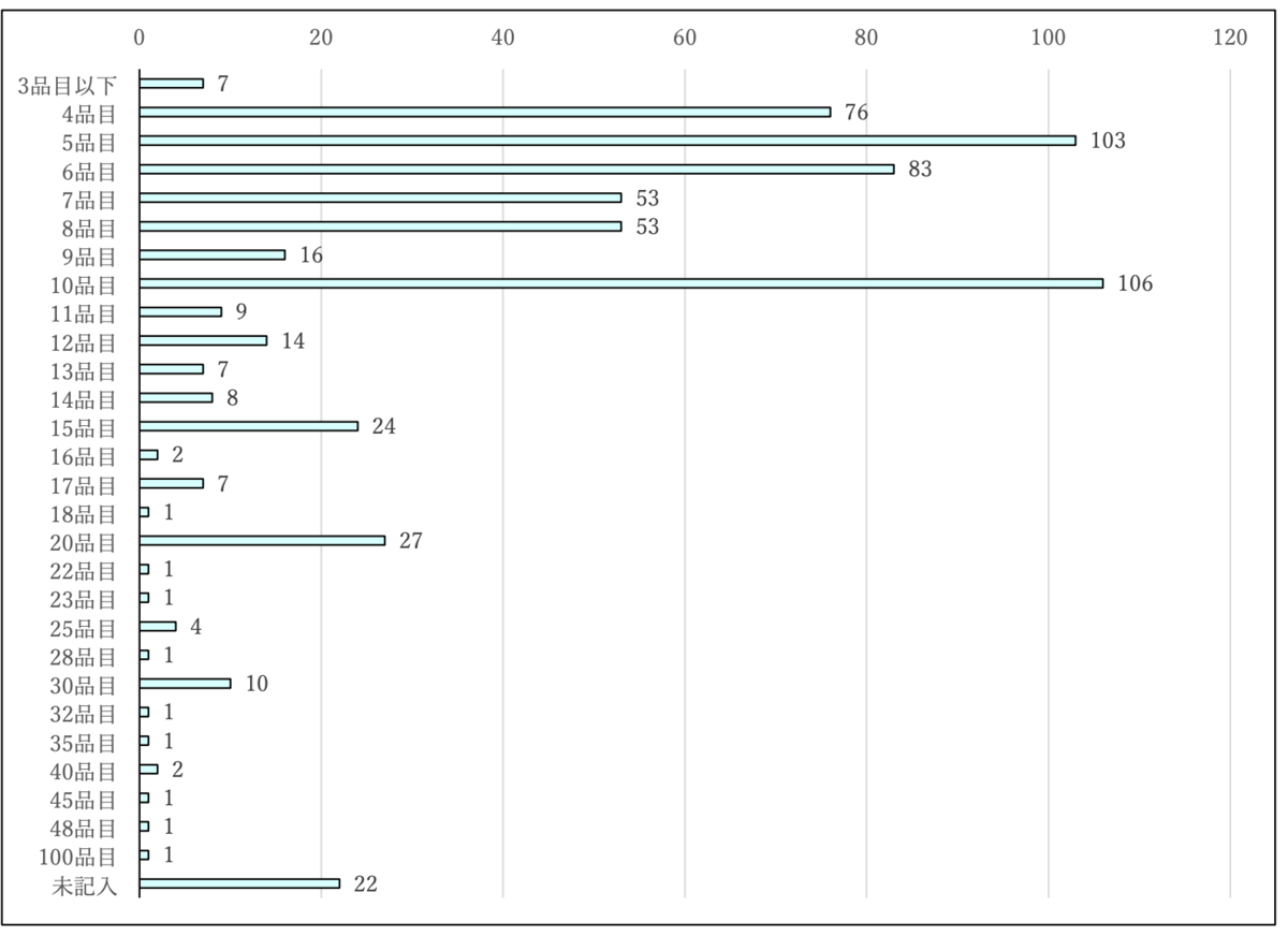 上記設問 3-1 で『4品目超』と答えた方 629 名の品目数を調べました。