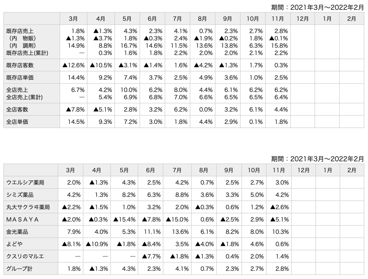 今期の3月〜11月までの9ヶ月累計では既存店売上が+2.2%、全店売上が+6.4%となっている。