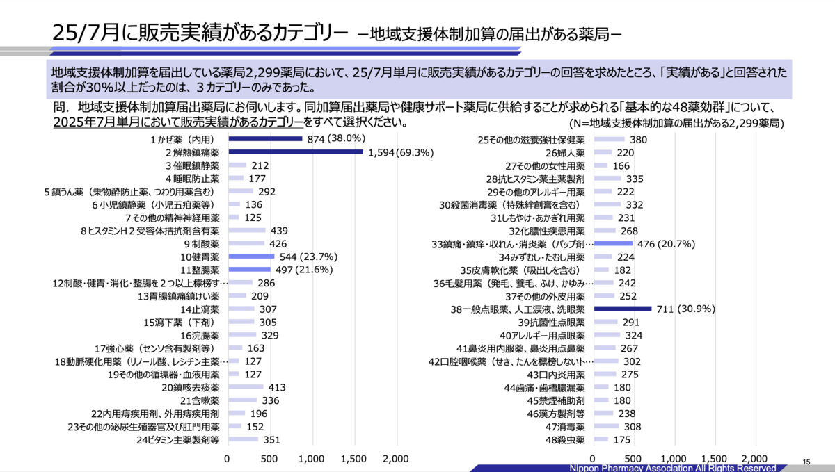 地域支援体制加算の届出薬局等に求められる「基本的な48薬効群」においては、薬効群によって販売実績に大きな差があった。2025年7月の1カ月間で販売実績があった割合が30%を超えたのは、加算届出薬局全体ではわずか3カテゴリーに留まった。これはドラッグストア併設薬局においても同様であり、半数以上の分類においてニーズが乏しい実態が見えたと指摘。
