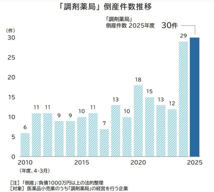 クローバー薬局(2025年、破産)は、大手ドラッグストアの新規出店による競合激化に加え、薬剤師の確保に苦慮する状況が続き、最終的に破産となった。同業他社のM&Aや、介護や飲食業など経営多角化で乗り切ろうとしたものの、借入過多による資金繰りの悪化から経営が破綻するケースも散見されたという。