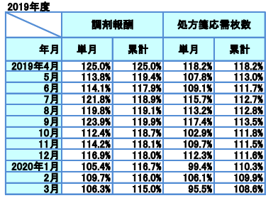 【2020.05.11配信】クオールホールディングスはマンスリーレポートを公表。3月単月の処方箋応需枚数は前年同月比4.5%減、調剤報酬は6.3%増だった。新型コロナウイルスの影響で処方箋応需枚数は減少したものの、長期処方が増えたことや技術料単価の上昇により調剤報酬は前年同月に比べ増加している。
